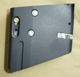 | This is the adapter unit. The mag catch is already installed. There is a magazine catch on the rear, it is adjustable for the various Enfields and different stocks. You can alter the height of the catch by loosening the screw and moving the catch either up or down. It is inserted just like a original magazine. | You can easily inlet the trigger guard with a Dremmel so the new mag catch can move freely. By inserting the adapter you can easily see and mark the areas that need to be removed. |
