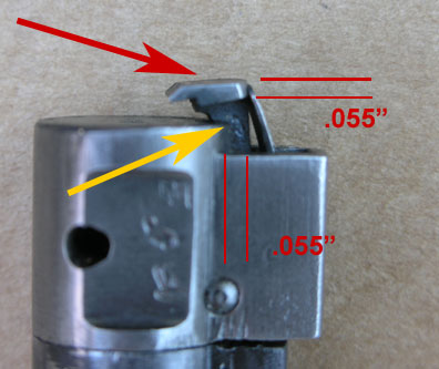 The extractor is very easy to modify. Simply grind the top down so the extractor top will not hit the barrel, this is what the red arrow is pointing to. Then grind the inside shoulder away so the extractor will curl over further and grab the smaller 45acp cartridge, this is what the yellow arrow is pointing to. |