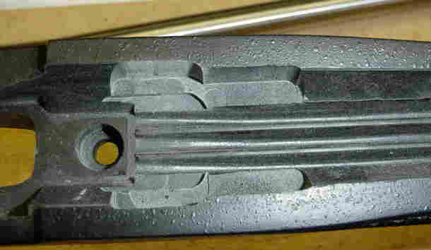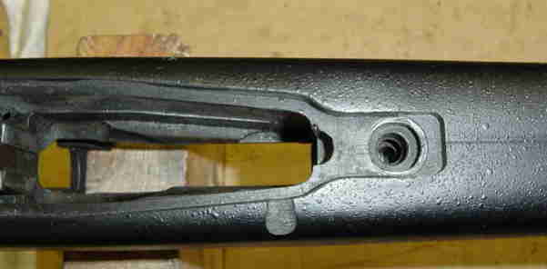 | You may have to re-inlet the stock for the trigger guard in front of the screw hole. This is very easy if you have a milling machine. | You will have to re-inlet the stock for the barrel nut and wider barrel on some stocks. This can be done with chisels or a Dremmel. Here you can see the were the stock was widened using a milling machine. |