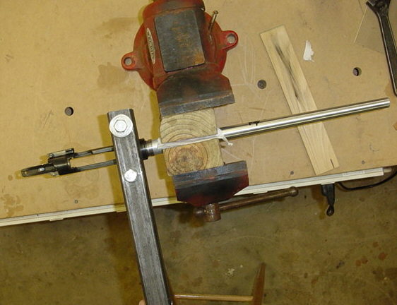 Install the barrel and headspace. This is not as hard as it sounds on a bolt action. For installing the barrels, I use a vise with 2 blocks of wood. The wood has a channels cut into it for the barrel. I start by wrapping the barrel with a paper towel and place the wood blocks around it, then place those into a vise. Now install the receiver wrench and tighten the barrel all the way on. NOTE: the vise in the pic is not bolted down, it will flop all over the place. | ![]() |