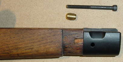 If you are using the old Mauser stock then you will need to shorten it some. Use a saw to cut the front section down. I cut mine so there is enough material for the original bottom band. I then insert a brass thingy with glue so that I can mount the bayonet stud on the front. | ![]() |